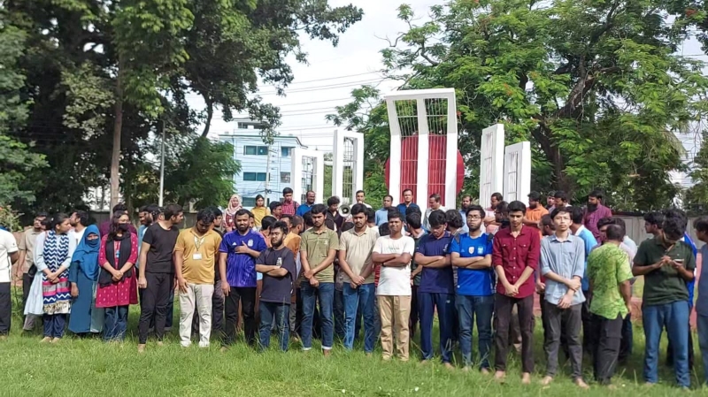 Rajshahi University, Aug 1 – Members of the Rajshahi University Teachers Network, along with students from various institutions in Rajshahi, participated in a silent march today to protest the killing of students nationwide. Participants wore red clothing as a symbol of their demonstration.
